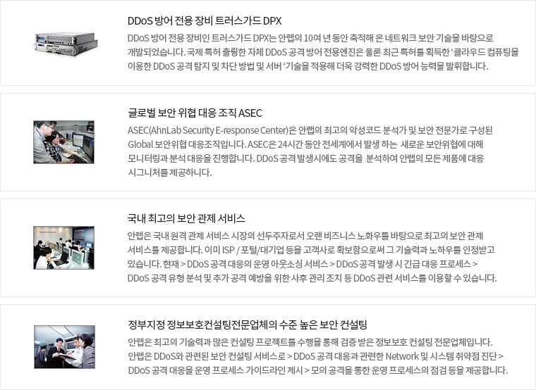¾È·¦ Æ®·¯½º°¡µå DPX(AhnLab TrusGuard DPX)·Î ¾È·¦¸¸ÀÇ Æ¯º°ÇÑ Àü¹æÀ§ÀûÀÎ DDoS ¹æ¾î ÇÁ·Î¼¼½º¸¦ °æÇèÇÏ½Ç ¼ö ÀÖ½À´Ï´Ù.