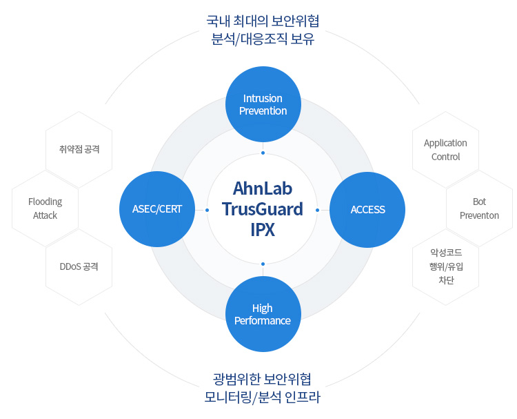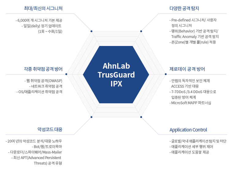 AhnLab TrusGuard IPX(Intrusion Prevention eXpress)´Â ±¹³» ÃÖ´ë ¼öÁØÀÎ 6000¿© °³ÀÇ Á¤È®ÇÑ Ãֽаø°Ý ´ëÀÀ ½Ã±×´Ïó¸¦ º¸À¯ÇÑ ÃÖ°íÀÇ IPS(Intrusion Prevention System) ÀåºñÀÔ´Ï´Ù.