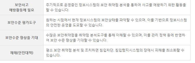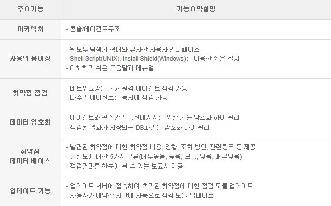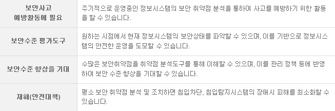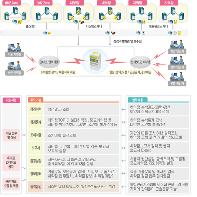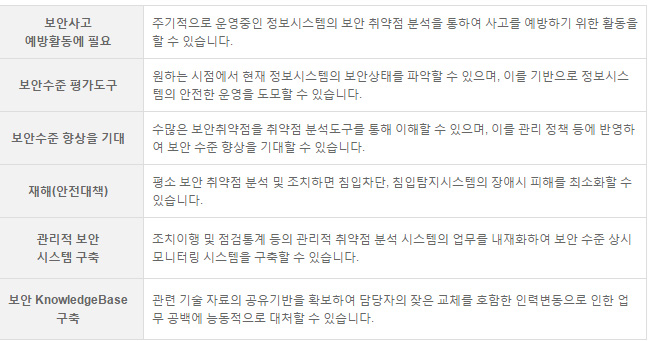 µû¶ó¼ Àüü ¹× ¼¹ö º° Ãë¾àÁ¡ ÇöȲÀÇ Àϰý ÆÄ¾ÇÀ» ÅëÇÑ º¸¾È ¼öÁØ »ó½Ã ¸ð´ÏÅ͸µÀ» ÇÒ ¼ö ÀÖÀ¸¸ç, Ãë¾àÁ¡ ºÐ¼® ¹× Á¶Ä¡¿¡ ´ëÇÑ ÇöȲ°ü¸®¸¦ ÇÒ ¼ö ÀÖÀ¸¸ç, °íÀ¯ÀÇ ºÐ¼® ´ëÀÀ±â¼úÀ» ÃàôÇÏ°í °ü·ÃÀڷḦ È®º¸ÇÏ¿© º¸¾ÈÃë¾àÁ¡ ºÐ¼® ¹× ´ëÀÀ ±â¼úÀÇ »ó½Ã Àû¿ë ¹× ¿î¿µÀÌ °¡´ÉÇÕ´Ï´Ù.