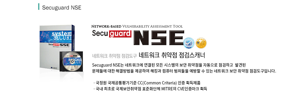 ±¹³» ±â¼ú·Î °³¹ßµÈ Secuguard NSE(System Security Explorer)´Â ½Ã½ºÅÛÀÇ º¸¾È Ãë¾àÁ¡À» ÀÚµ¿À¸·Î Á¡°ËÇÏ°í ¹ß°ßµÈ ¹®Á¦µé¿¡ ´ëÇÑ ÇØ°á¹æ¹ýÀ» Á¦°øÇÏ¿© ÇØÅ·°ú ÄÄÇ»ÅÍ ¹üÁ˵éÀ» ¿¹¹æÇÒ ¼ö ÀÖ´Â ½Ã½ºÅÛ º¸¾È Ãë¾àÁ¡ Á¡°Ëµµ±¸ÀÔ´Ï´Ù.